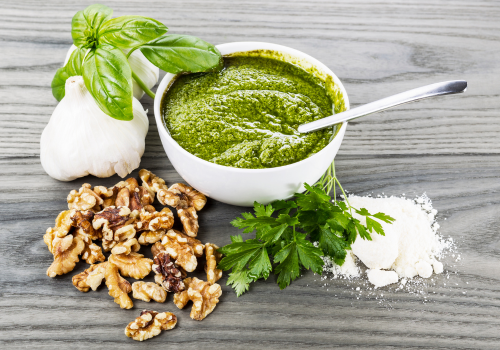 En un procesador de alimentos o vaso batidor, añade las hojas de albahaca lavadas y secas, el ajo, el parmesano, el zumo de limón (opcional) y las nueces tostadas. -