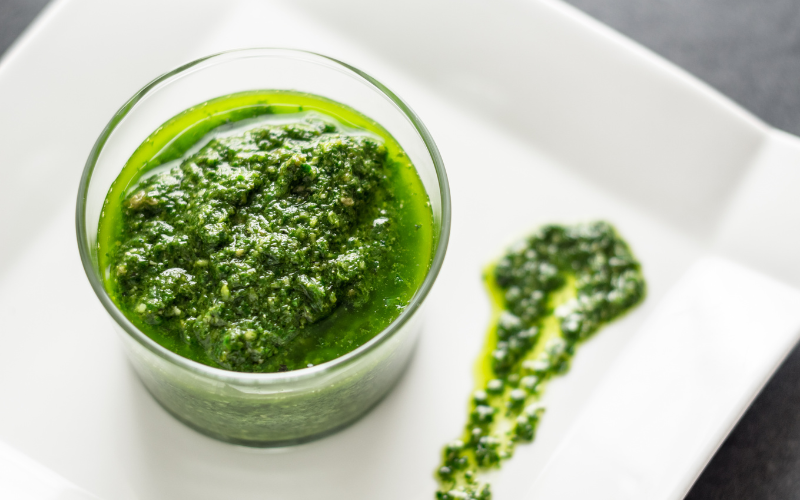 En una sartén amplia, calienta ligeramente el pesto a fuego bajo (sin hervir).